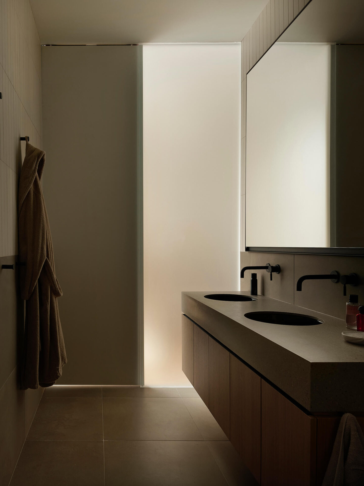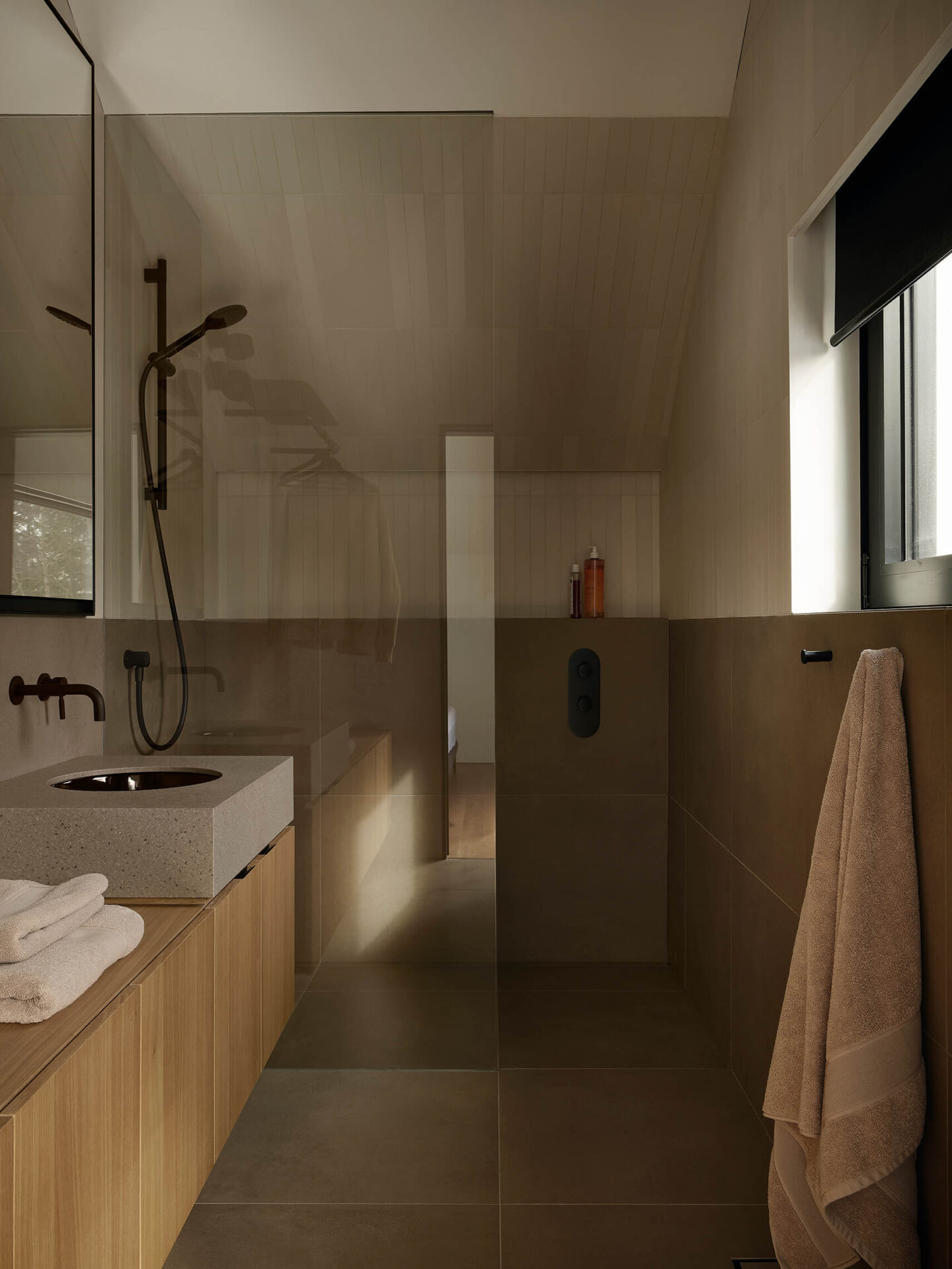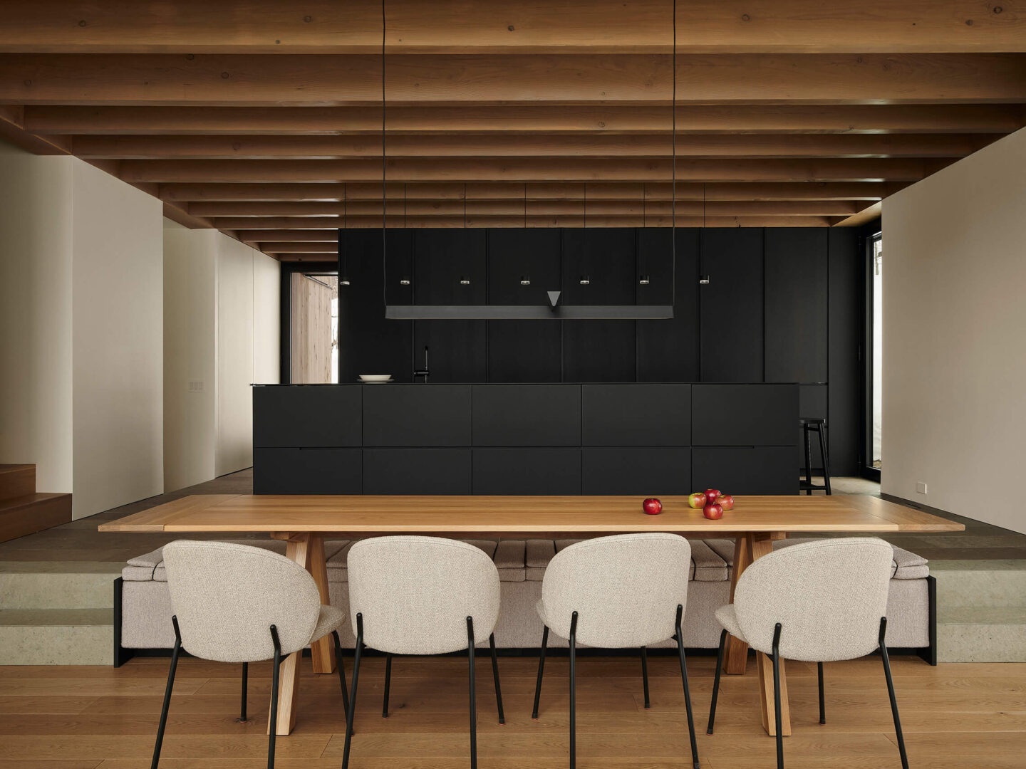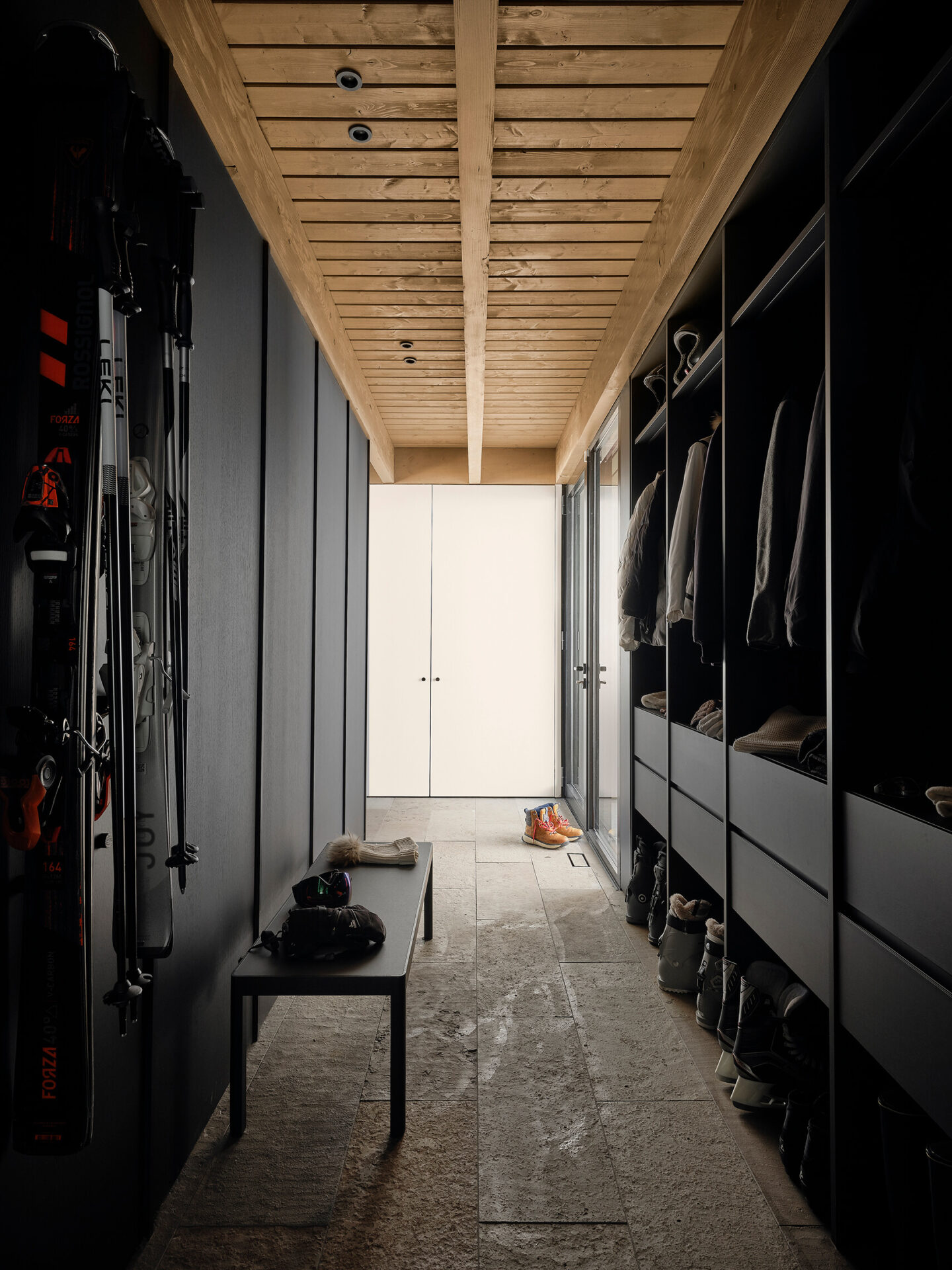 La composition architecturale se déploie en deux volumes qui glissent longitudinalement, créant des connexions stratégiques avec la topographie du site. À l’avant, cette articulation accueille l’entrée depuis le chemin d’accès. À l’arrière, une terrasse se connecte aux espaces de vie, et son plateau se prolonge pour rejoindre le niveau naturel du sol, établissant une transition fluide vers le lac. Le premier volume abrite les espaces communs et se distingue par ses débords de toiture qui protègent à l’arrière une façade entièrement vitrée ouverte sur le lac, révélant des espaces intérieurs en double hauteur qui amplifient la relation visuelle avec le paysage. Le second volume, plus épuré et dépourvu de débord de toit, contient cinq chambres et leurs salles de bain, permettant d’accueillir une famille nombreuse. Cette capacité d’hébergement répond au désir de rassemblements familiaux et permet de profiter pleinement des activités saisonnières, tant du ski alpin en hiver, que des sports nautiques en été.