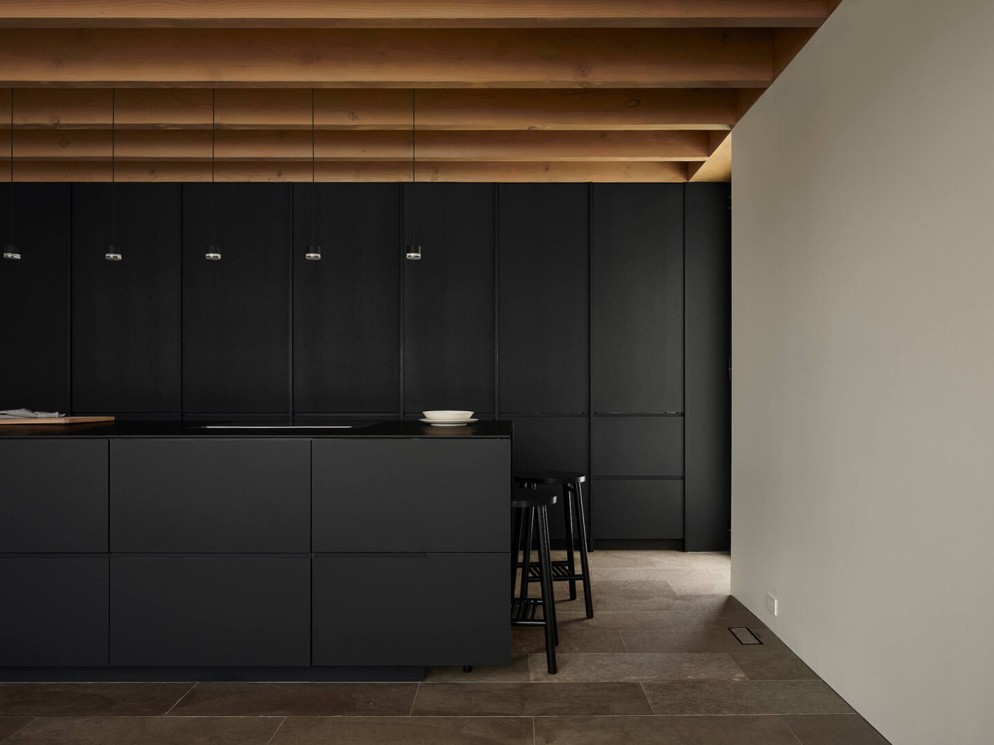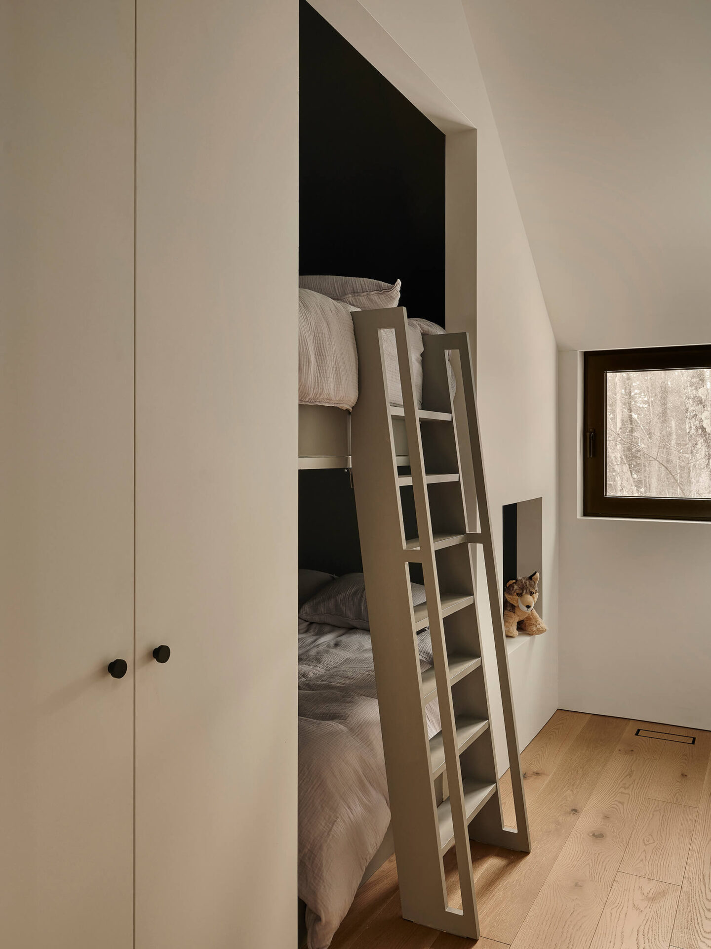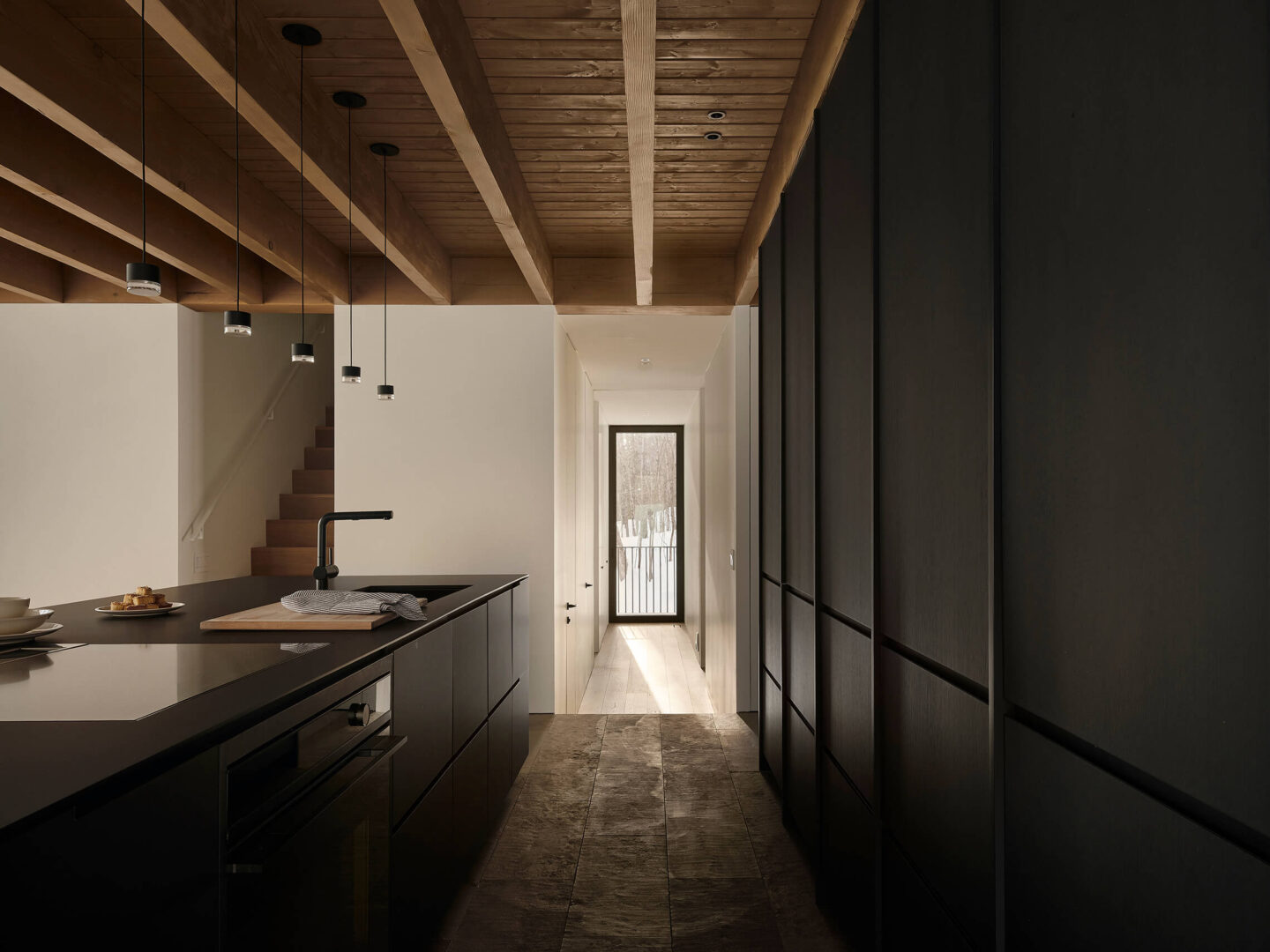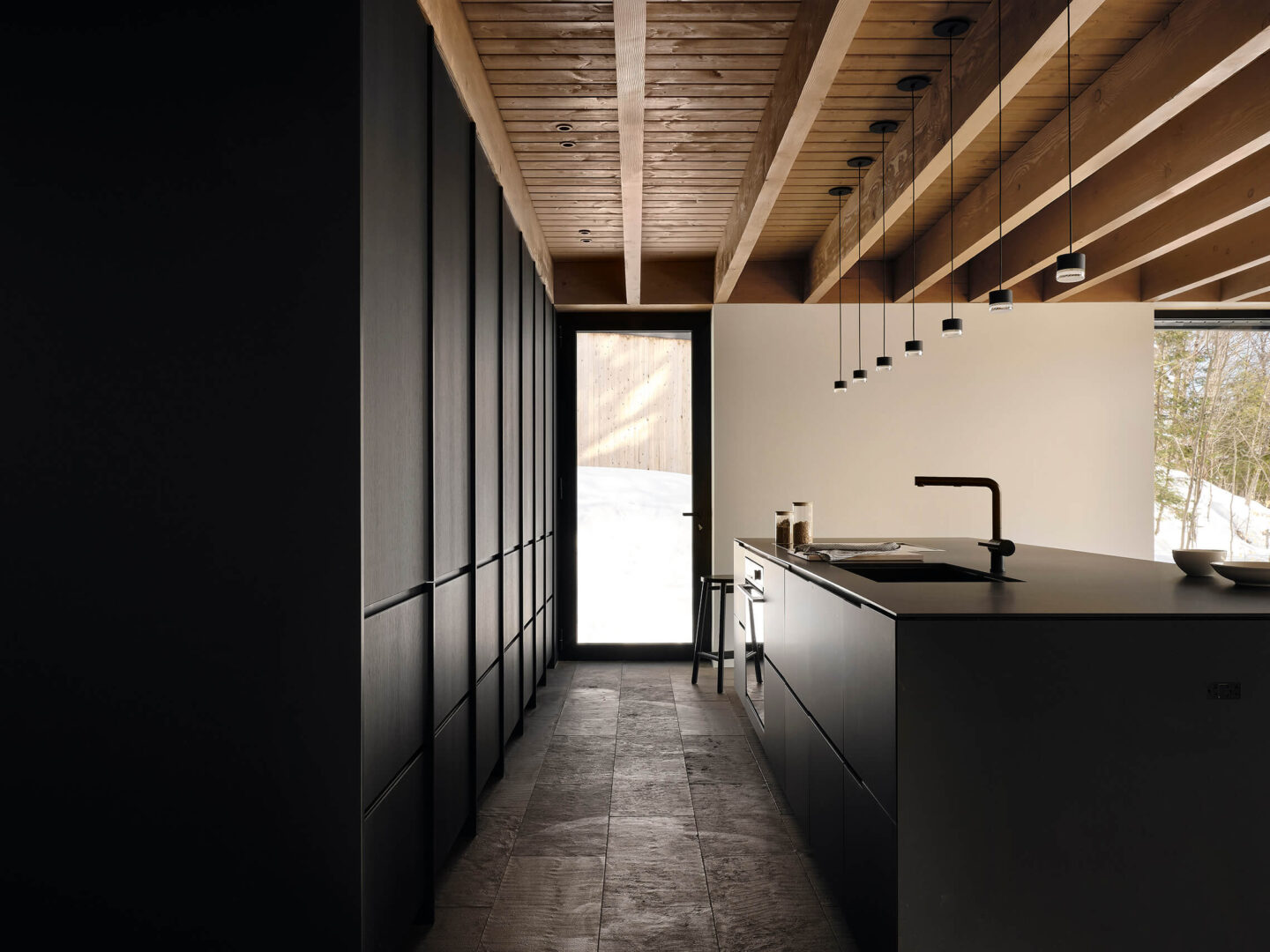 La matérialité s’inscrit dans la durée et la tradition. Le revêtement extérieur en clin vertical de cèdre grisonnera naturellement au fil des ans, ce qui permettra à la maison de se marier à la toile de fond des troncs d’arbre longilignes. La toiture sombre se perd dans la canopée dense qui la surplombe. À l’intérieur, les matériaux évoquent l’héritage des chalets laurentiens : pierre brute et structure apparente de sapin Douglas créent une ambiance chaleureuse. Cette palette naturelle entre en dialogue avec les éléments de mobilier intégré noir, dont la sobriété contemporaine ponctue les espaces.