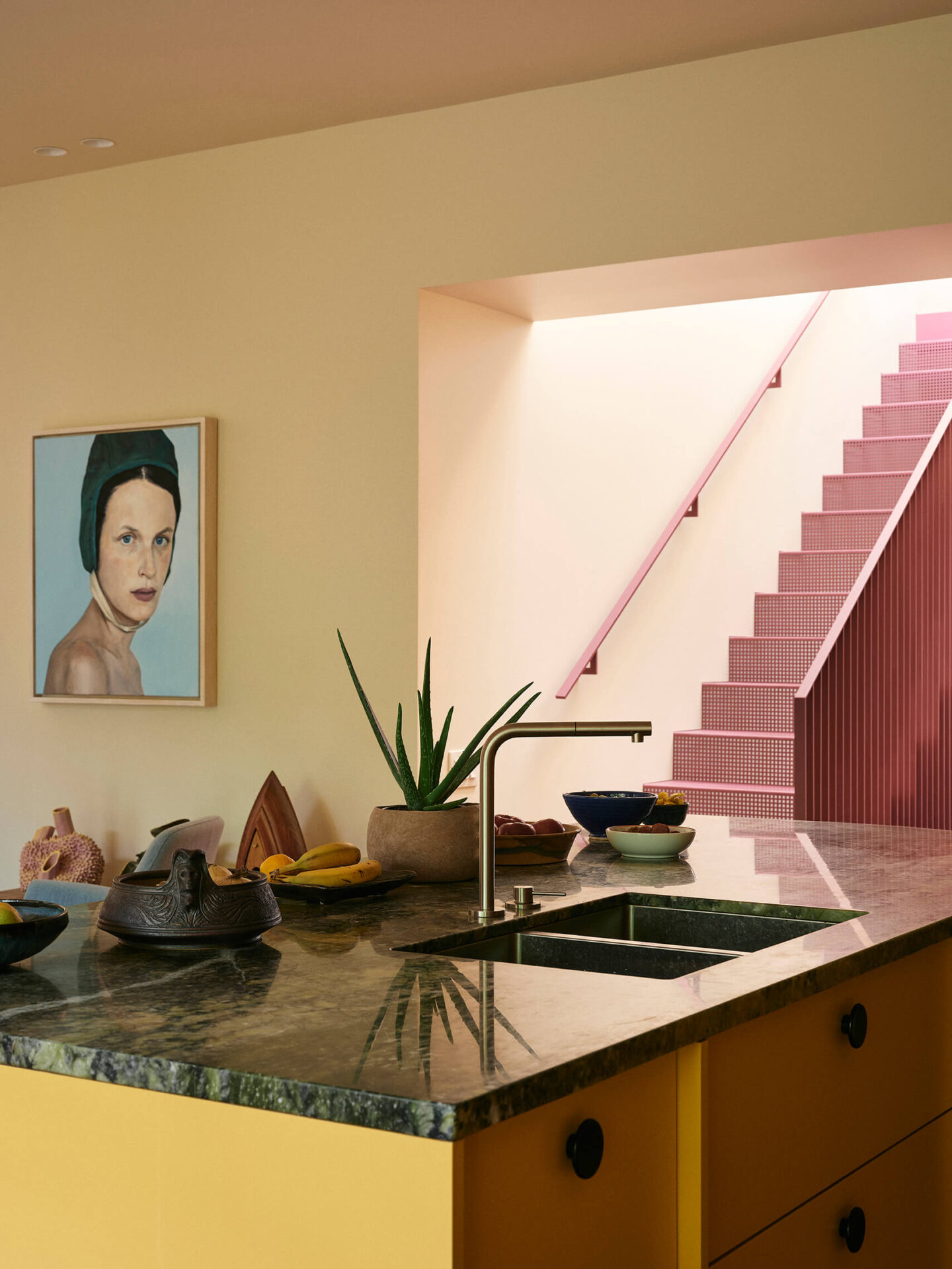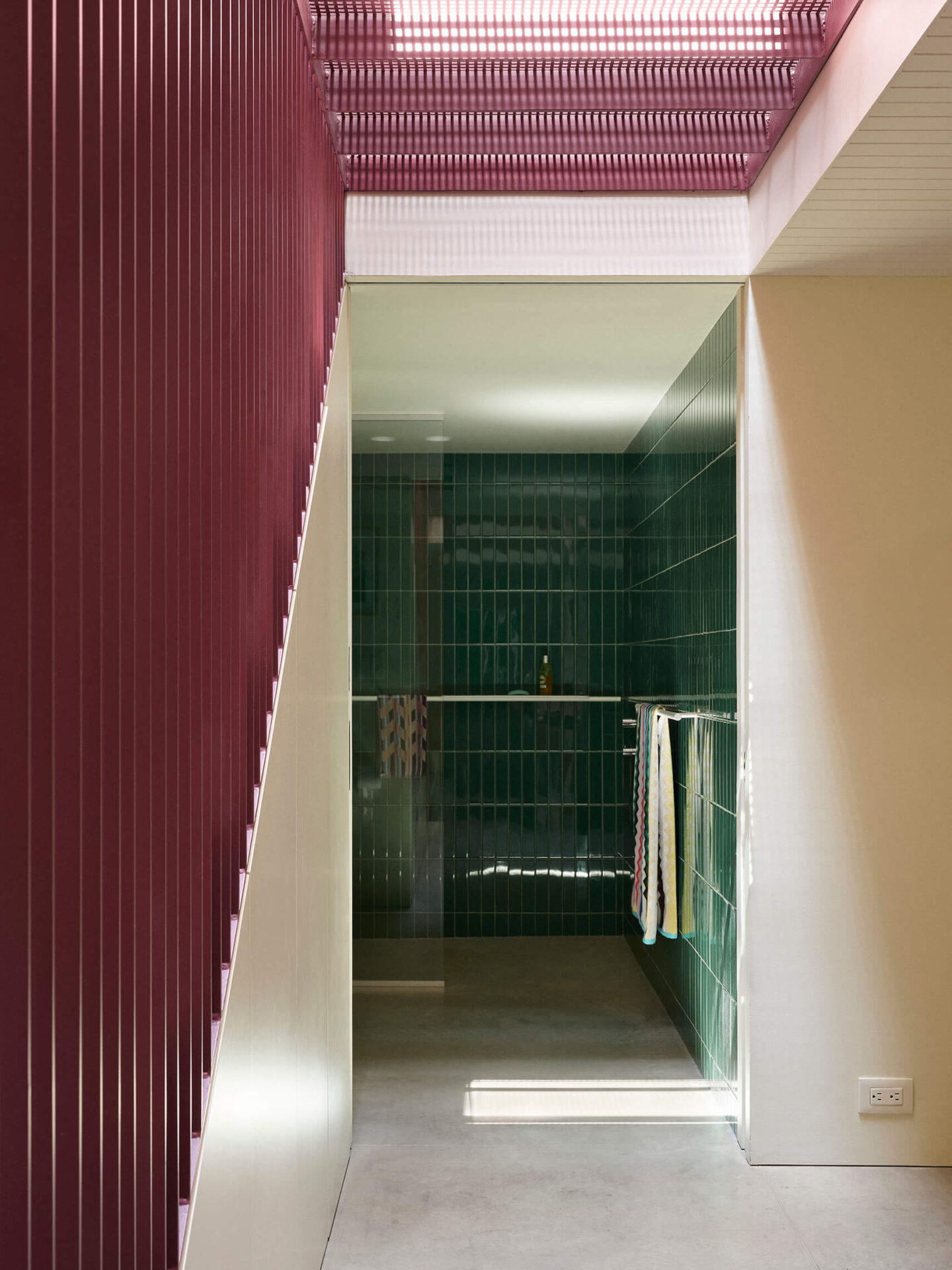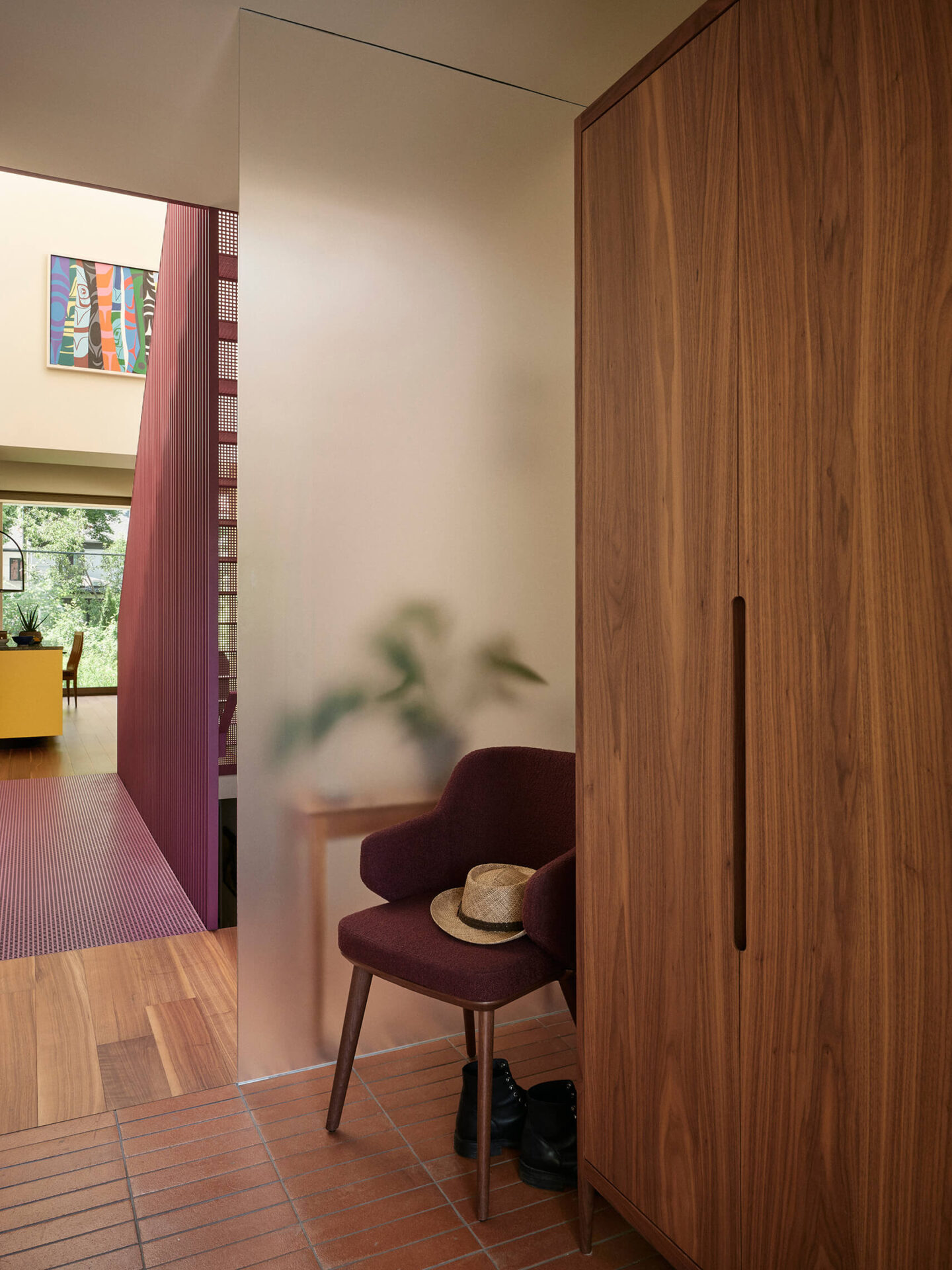 Six couleurs – le crème, le framboise, l’orange, le vert, le jaune et l’aubergine – devaient habiter le projet, sans indication quant à leur emplacement. Le défi des architectes était d’orchestrer cette palette vibrante avec cohérence et précision. Plutôt que de s’en remettre à la peinture murale, ce sont les matériaux eux-mêmes qui portent les teintes : tuiles de terre cuite aux murs, comptoir de marbre vert avocat et armoires laquées jaune citron en cuisine. Dans la salle de bain de l’étage, un dégradé de mauve se déploie sur les murs avec des tuiles allant de l’aubergine au framboise.