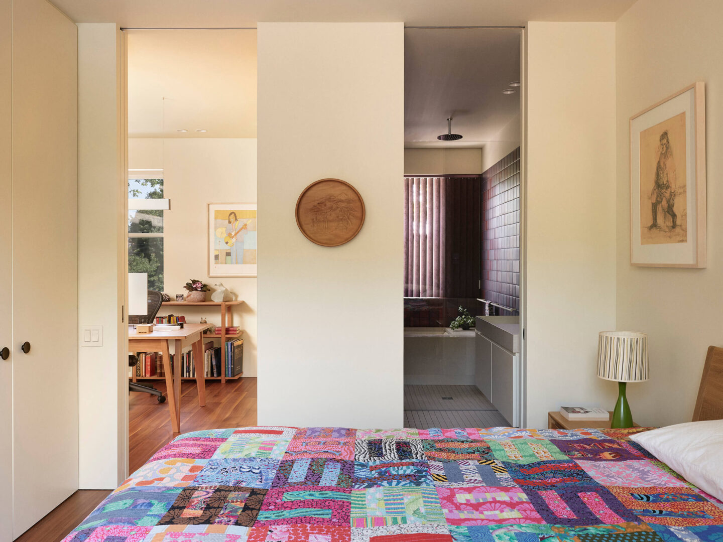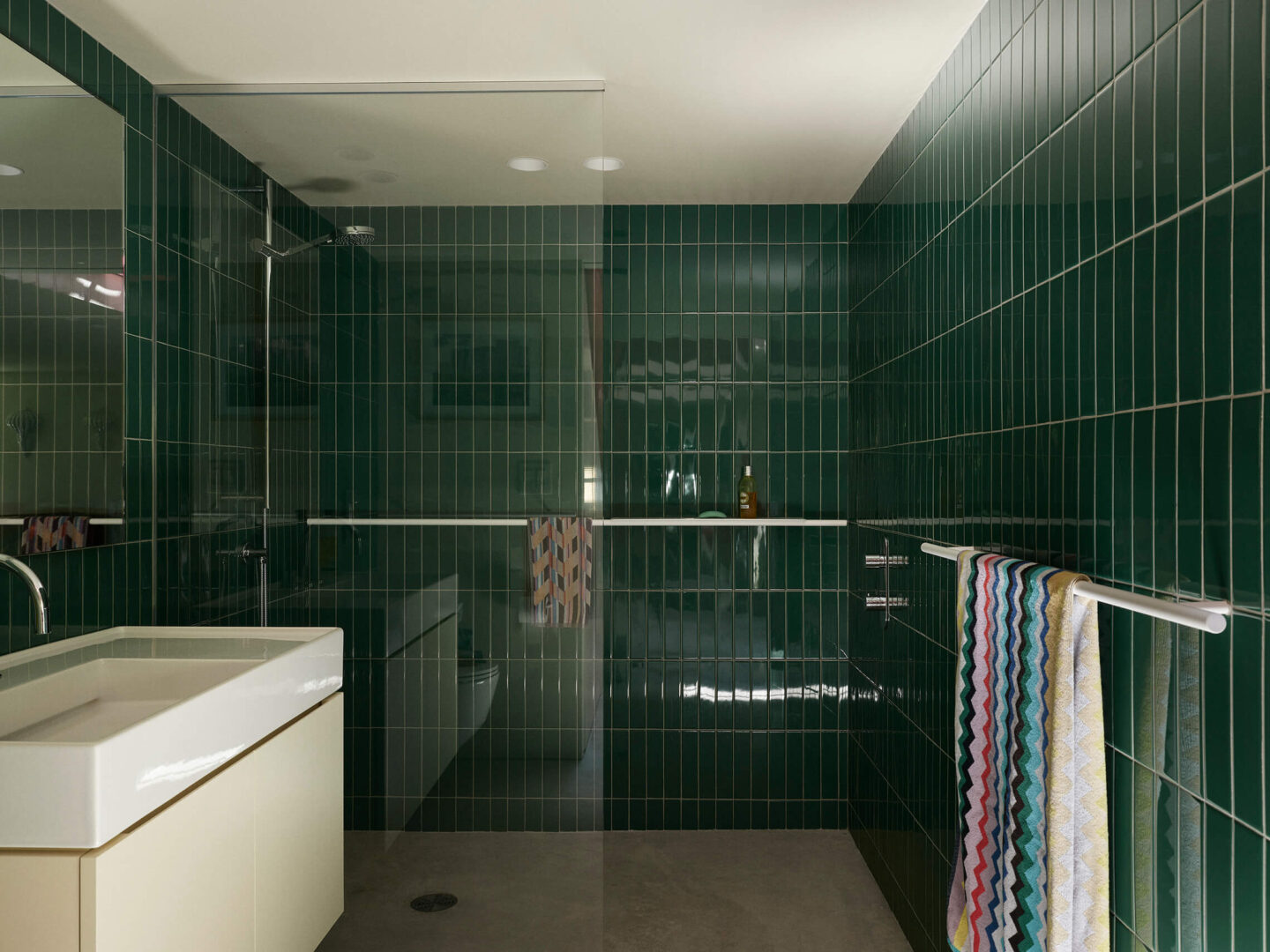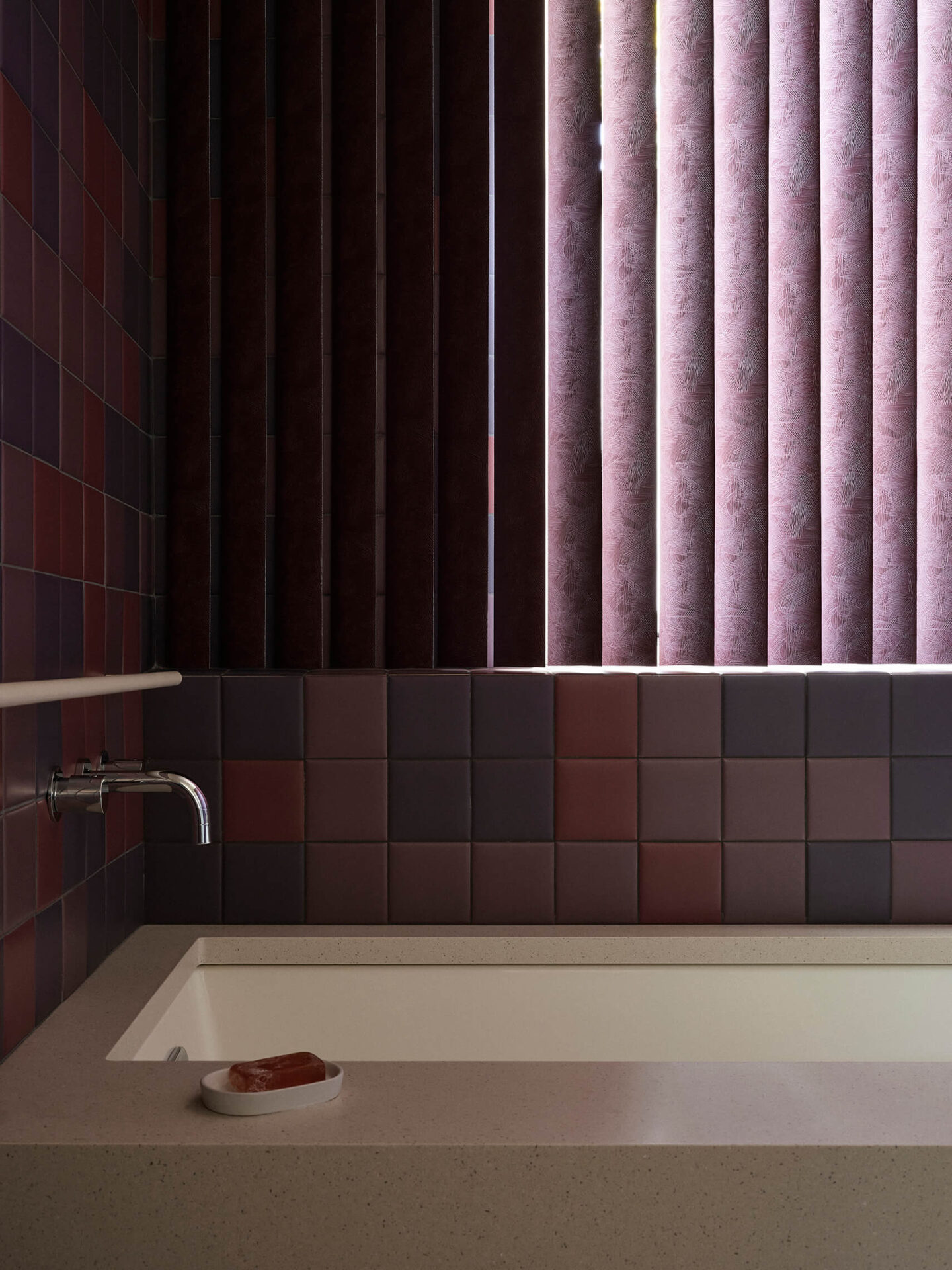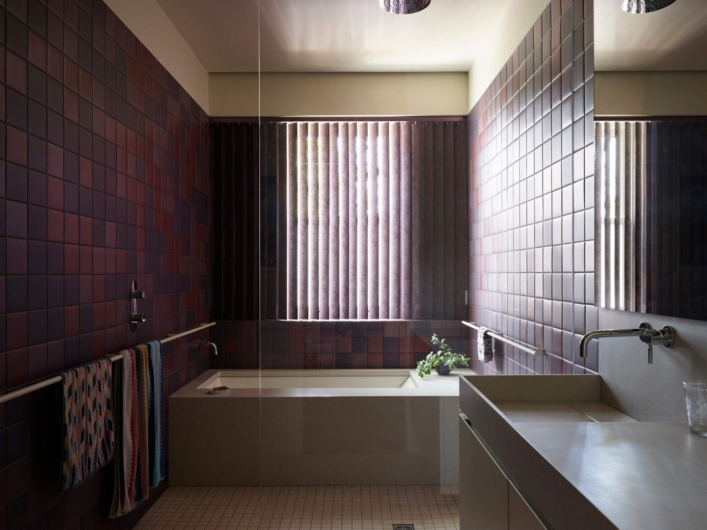 Six couleurs – le crème, le framboise, l’orange, le vert, le jaune et l’aubergine – devaient habiter le projet, sans indication quant à leur emplacement. Le défi des architectes était d’orchestrer cette palette vibrante avec cohérence et précision. Plutôt que de s’en remettre à la peinture murale, ce sont les matériaux eux-mêmes qui portent les teintes : tuiles de terre cuite aux murs, comptoir de marbre vert avocat et armoires laquées jaune citron en cuisine. Dans la salle de bain de l’étage, un dégradé de mauve se déploie sur les murs avec des tuiles allant de l’aubergine au framboise.