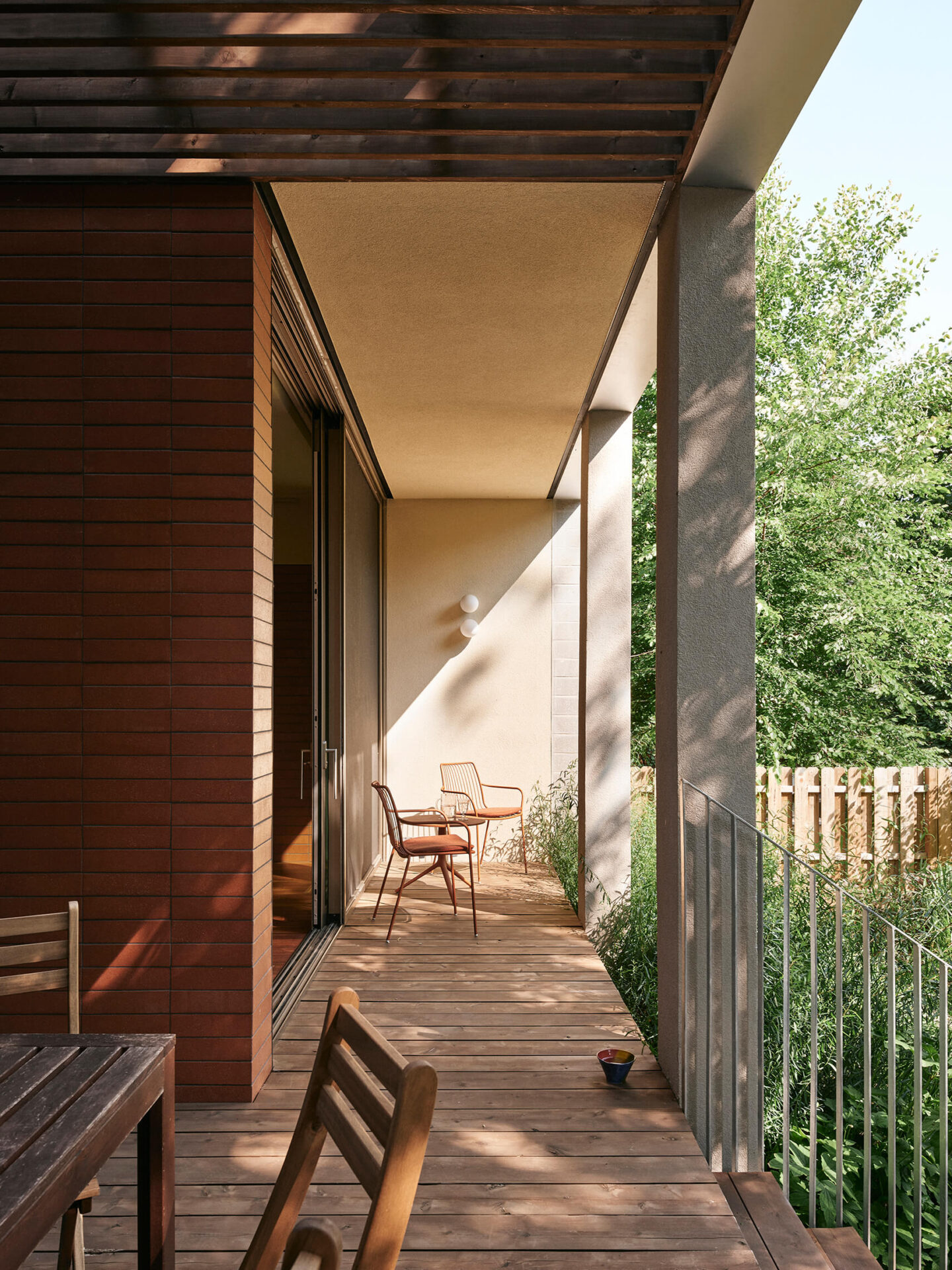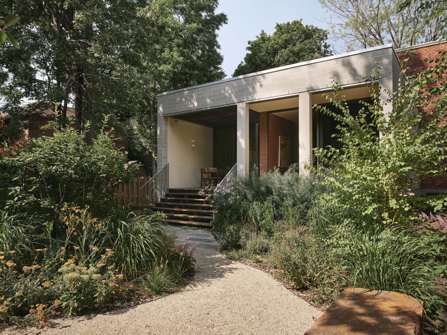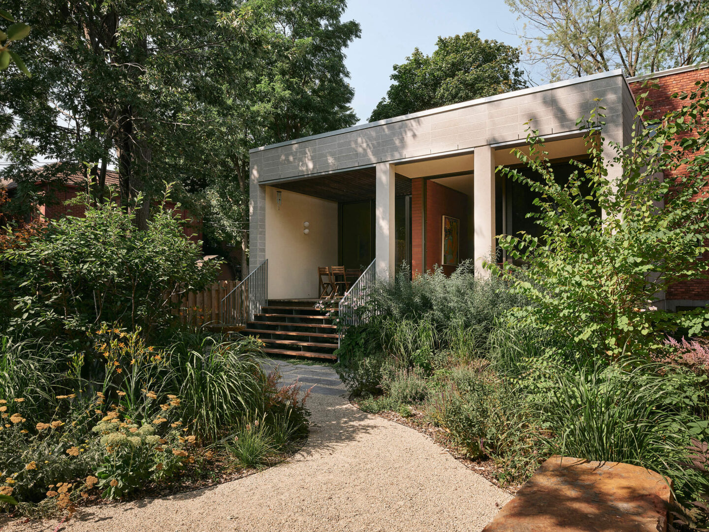 L’agrandissement arrière évoque un pavillon de jardin, avec des plafonds surélevés qui amplifient généreusement les espaces de vie. Un mur de terre cuite traverse la composition, définissant à la fois les zones intérieures et les galeries extérieures couvertes. À l’extérieur, plutôt qu’une clôture conventionnelle, des jardins aux tracés sinueux sculptent une intimité naturelle tout en préservant un dialogue visuel avec le voisinage.