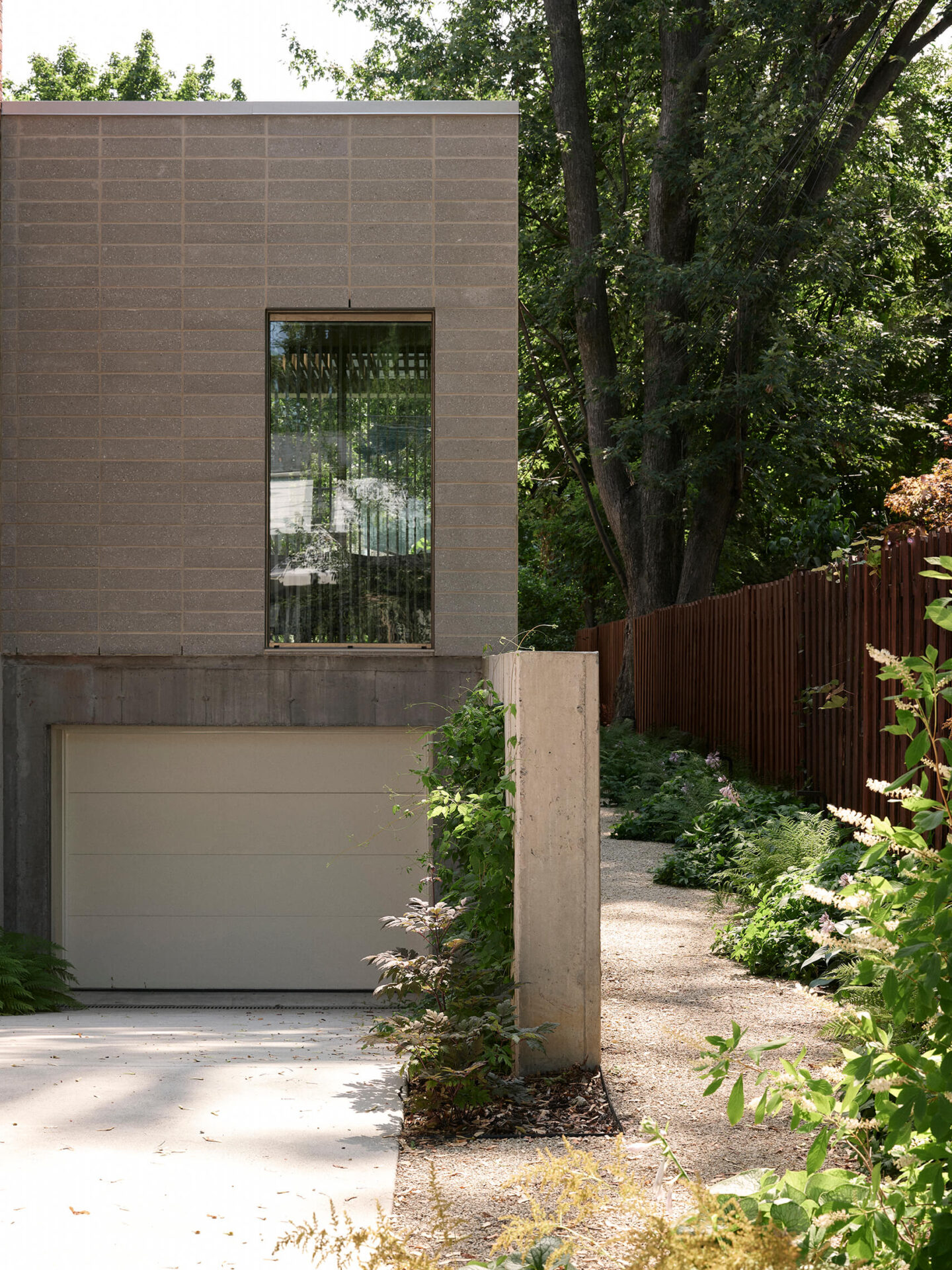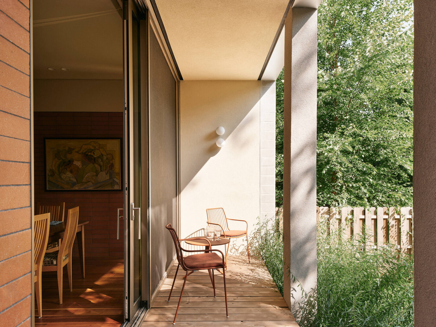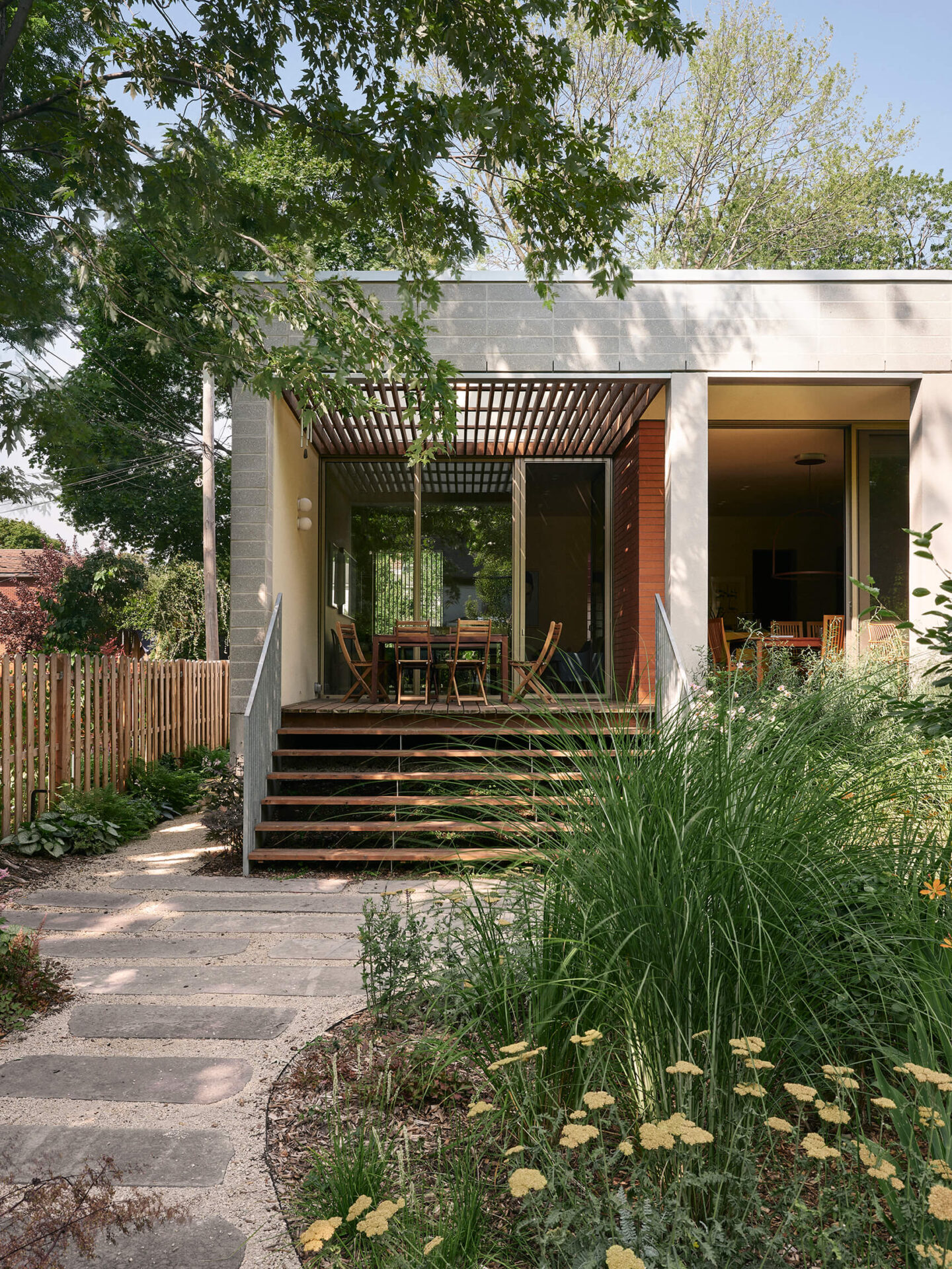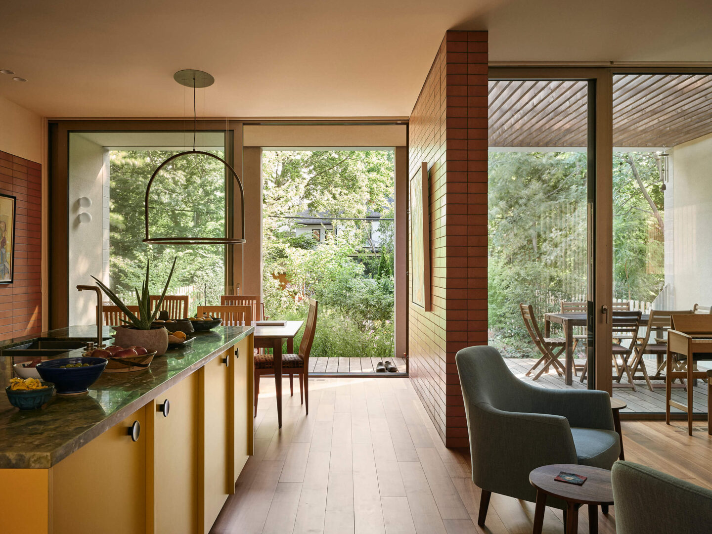 L’agrandissement arrière évoque un pavillon de jardin, avec des plafonds surélevés qui amplifient généreusement les espaces de vie. Un mur de terre cuite traverse la composition, définissant à la fois les zones intérieures et les galeries extérieures couvertes. À l’extérieur, plutôt qu’une clôture conventionnelle, des jardins aux tracés sinueux sculptent une intimité naturelle tout en préservant un dialogue visuel avec le voisinage.