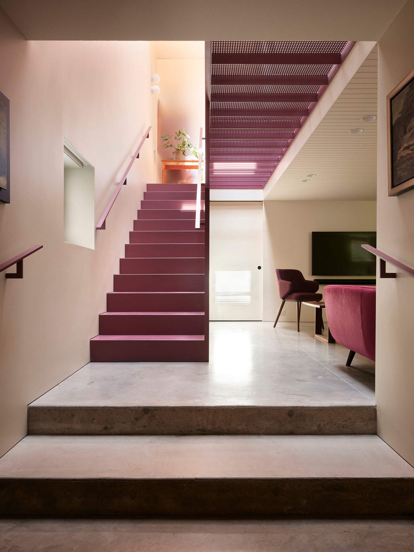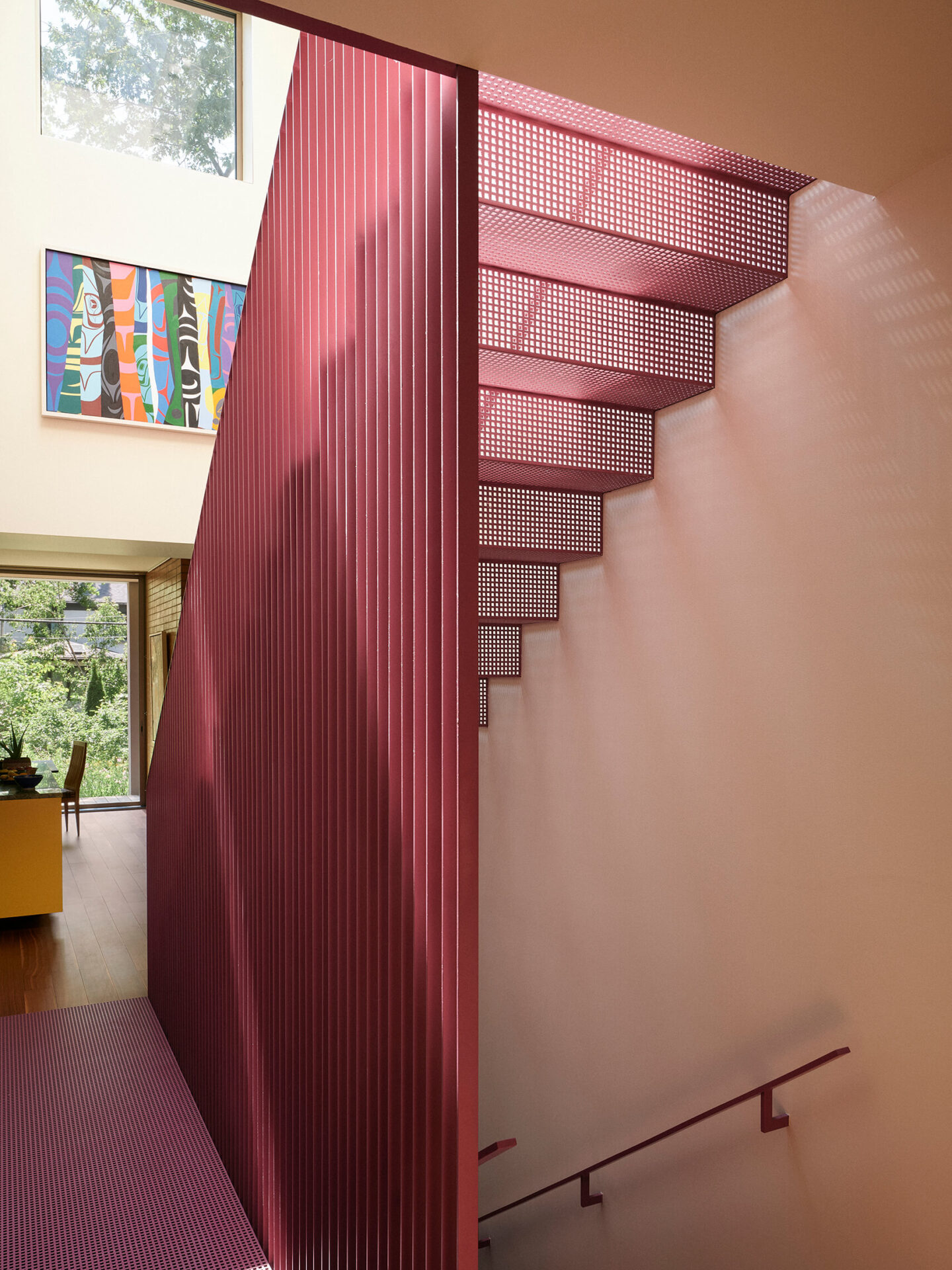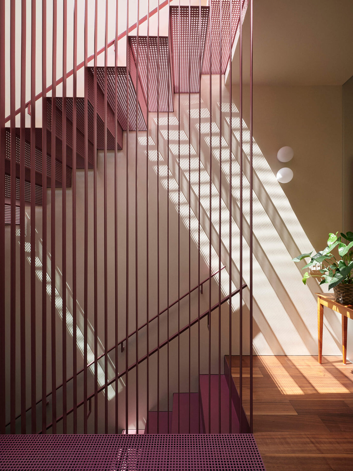 Le crème, comme un fil conducteur unissant l’ensemble, couvre la majorité des surfaces murales, rendant cohérent l’amalgame de teintes d’une pièce à l’autre, et laissant aux meubles et aux accessoires toute la place pour s’exprimer. Au cœur de la maison, l’escalier et sa passerelle en métal perforé peints aubergine deviennent un puits de lumière vertical qui diffuse la clarté naturelle jusqu’au sous-sol. Cet élément sculptural structure la circulation tout en démultipliant les jeux de transparence et d’ombre.