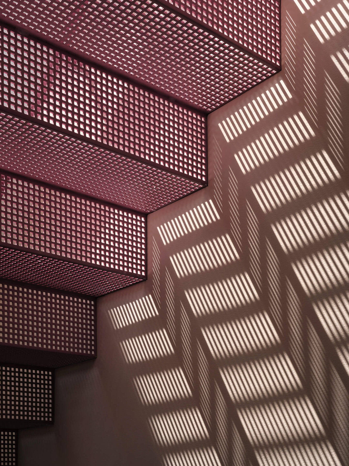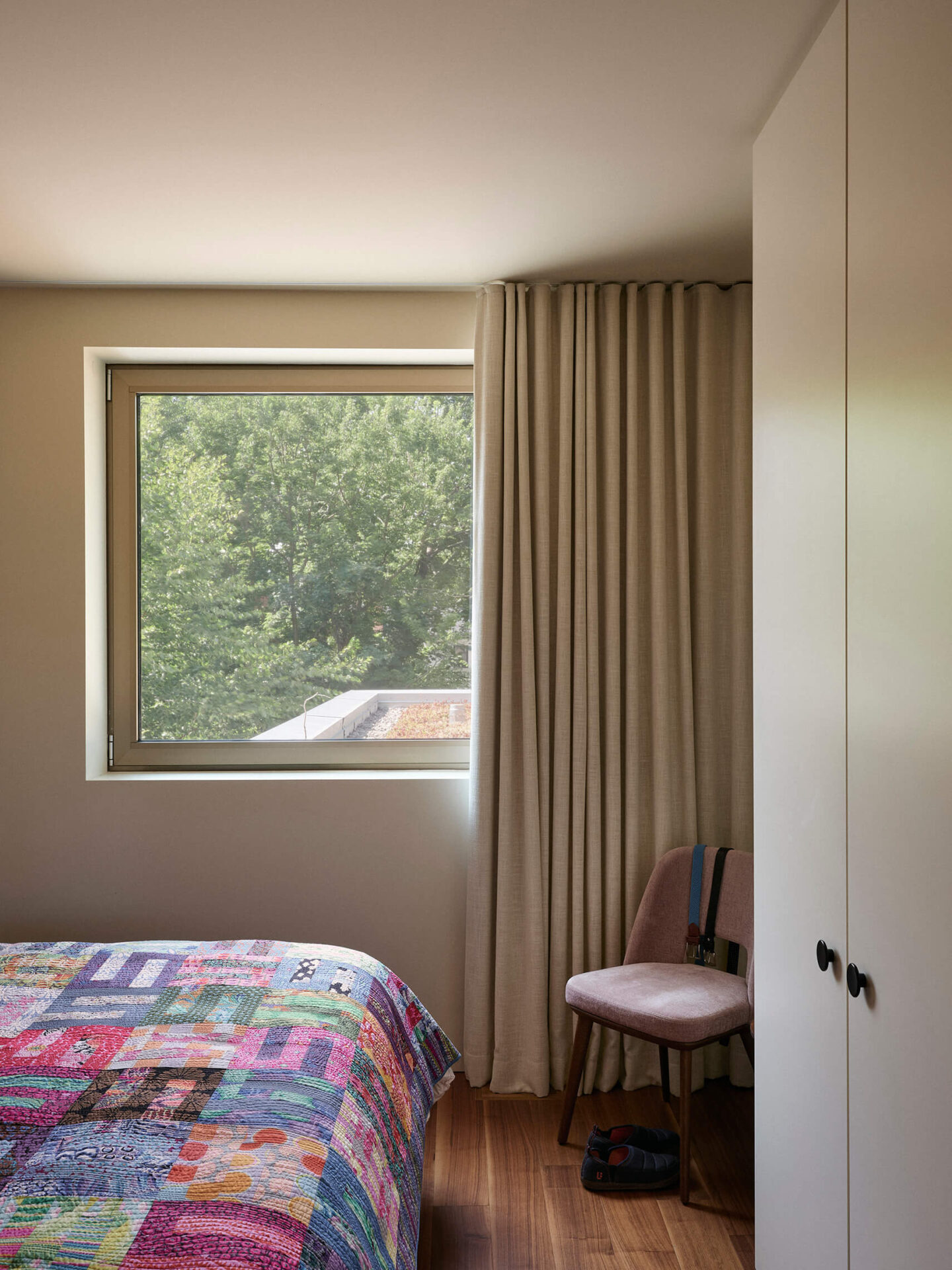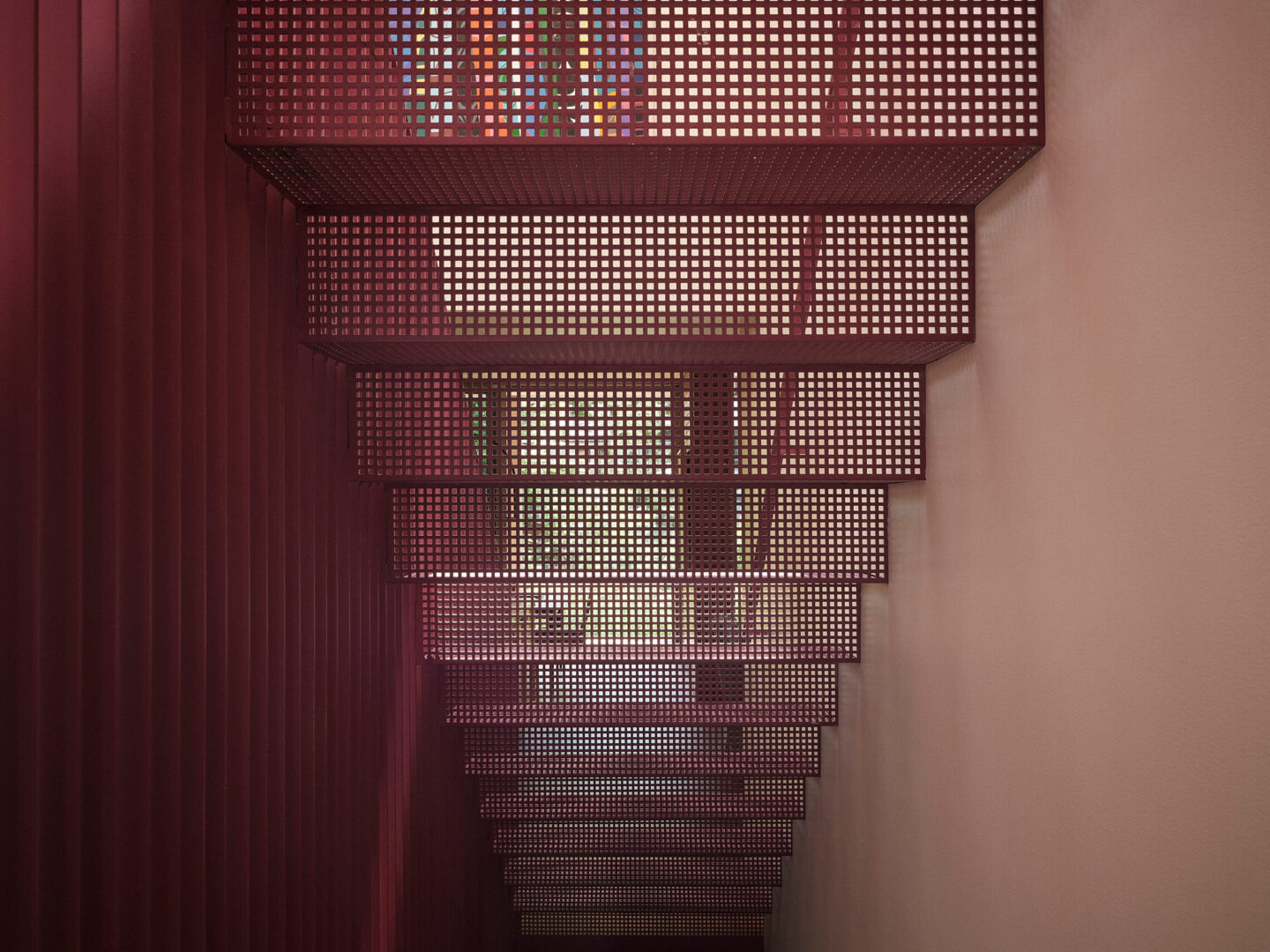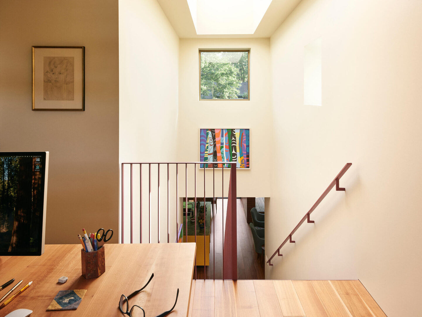 Le crème, comme un fil conducteur unissant l’ensemble, couvre la majorité des surfaces murales, rendant cohérent l’amalgame de teintes d’une pièce à l’autre, et laissant aux meubles et aux accessoires toute la place pour s’exprimer. Au cœur de la maison, l’escalier et sa passerelle en métal perforé peints aubergine deviennent un puits de lumière vertical qui diffuse la clarté naturelle jusqu’au sous-sol. Cet élément sculptural structure la circulation tout en démultipliant les jeux de transparence et d’ombre.