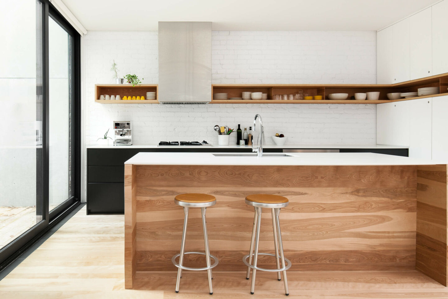 À l’intérieur, une palette neutre et sobre permet une lecture efficace du concept architectural : sur fond blanc se découpent des éléments clés du projet tandis que l’usage de l’érable naturel apporte chaleur à l’ensemble.